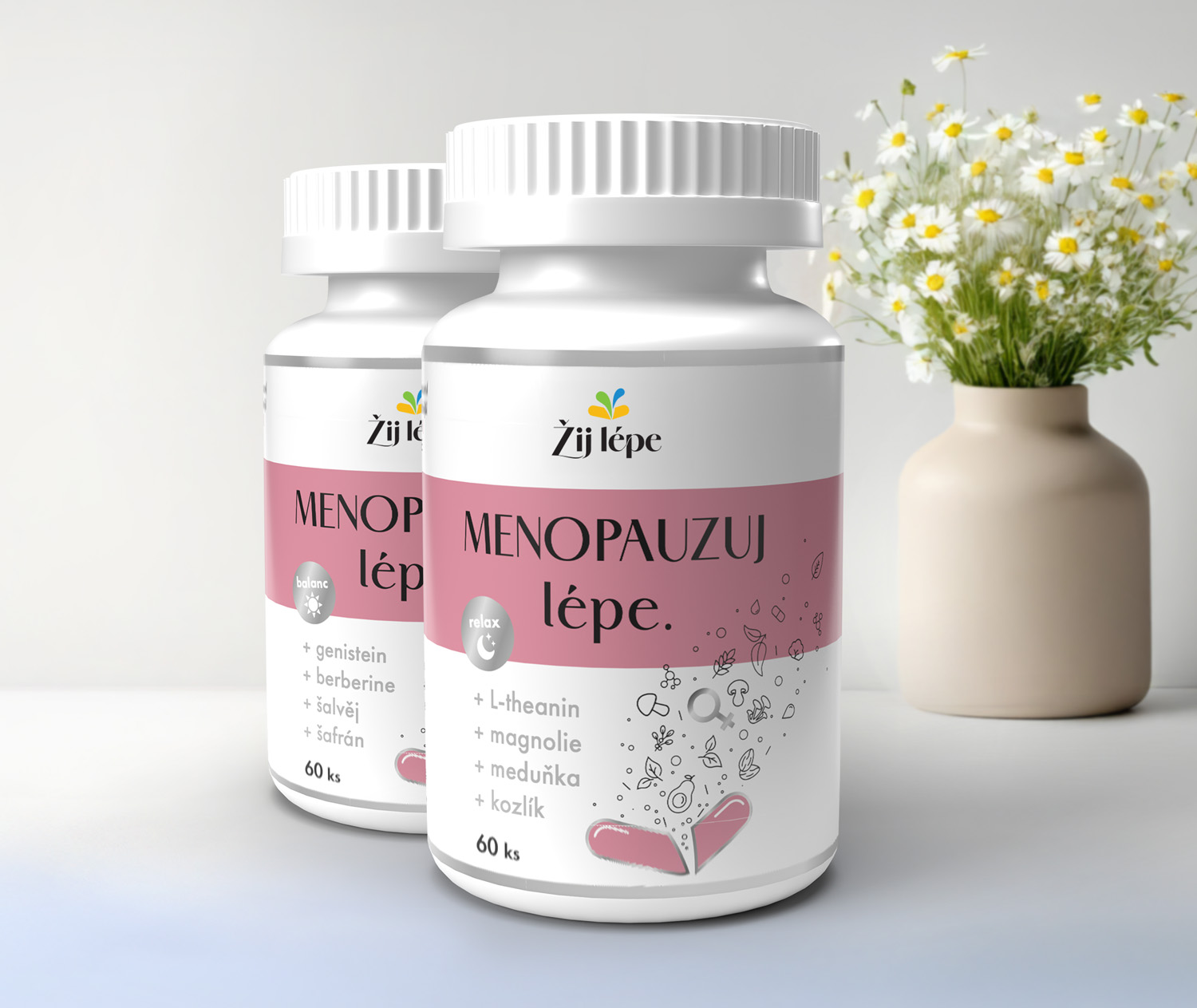 MENOPAUZUJ LÉPE. – kompletní program speciálně navržený pro pohodový průběh menopauzy: balení obsahuje dvě lahvičky pro vaši rovnováhu a klid: