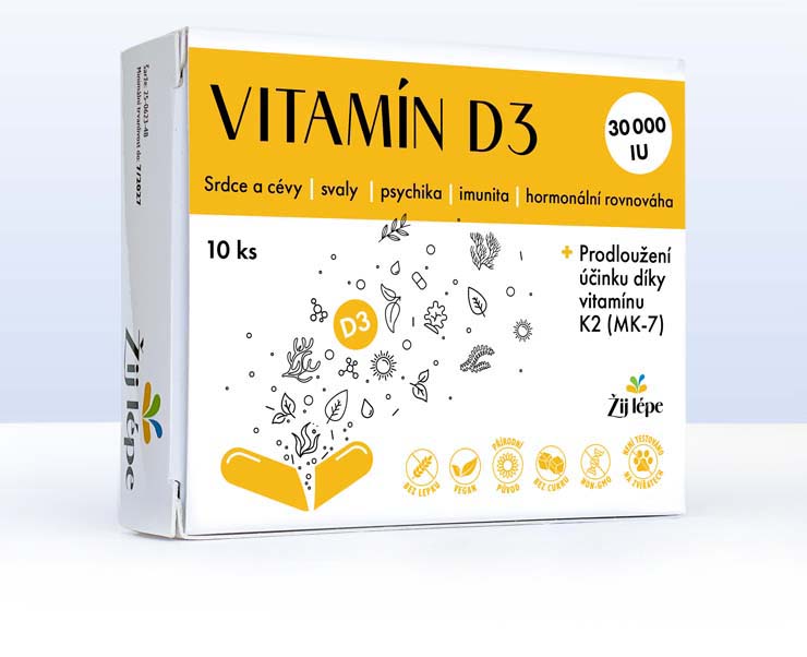 - Obsahuje vitamín D3 30 000 UI, vitamín K2 (MK-7) a MCT olej (triglyceridy se středně dlouhým řetězcem) ve formě prášku – kombinace těchto složek podporuje zdraví kostí, zubů, imunitního systému. Chrání před kornatěním tepen a snižuje riziko srdečně-cévních onemocnění.